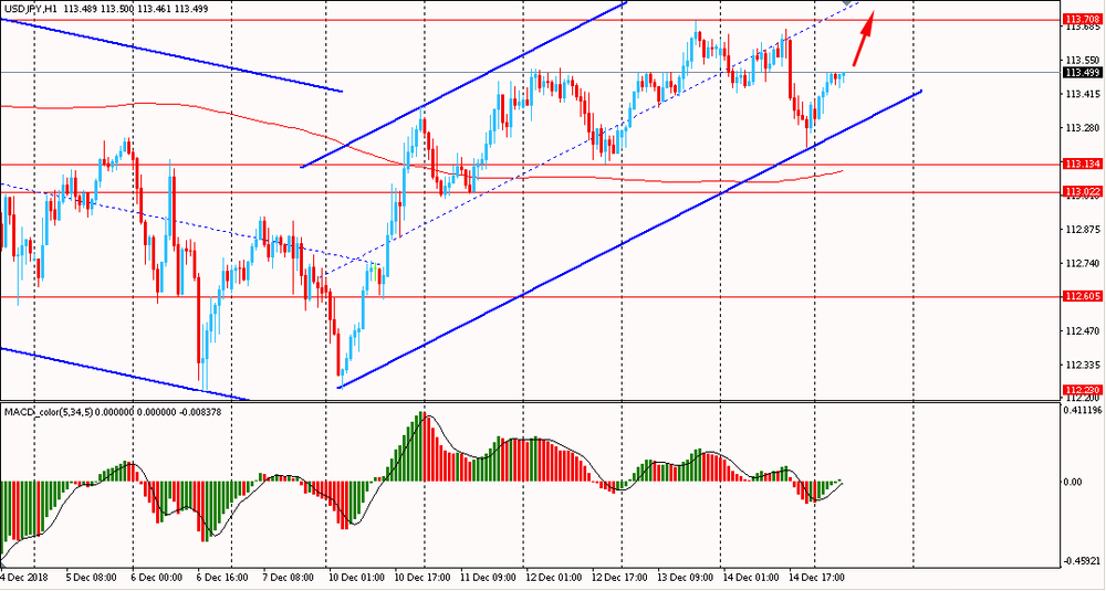 Сегодня утром пара USD/JPY выросла к Y113.45, восстановившись после пятничного снижения. В последний день прошлой торговой недели, оттолкнувшись от срединной линии канала, пара упала и закрыла день в красной зоне. Не смотря на эту коррекцию, на текущий момент USD/JPY остается в аптренде: торгуется выше линии скользящей средней MA 200 H1 и линии поддержки растущего канала от 7 декабря. Пока пара остается в данном аптренде, есть смысл и далее искать точки входа на покупку при формирование коррекций.