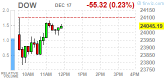 Большинство компонентов DOW в минусе (21 из 30). Лидер роста - The Boeing Company (BA, +2.13%). Аутсайдер - The Procter & Gamble Company (PG, -2.37%).