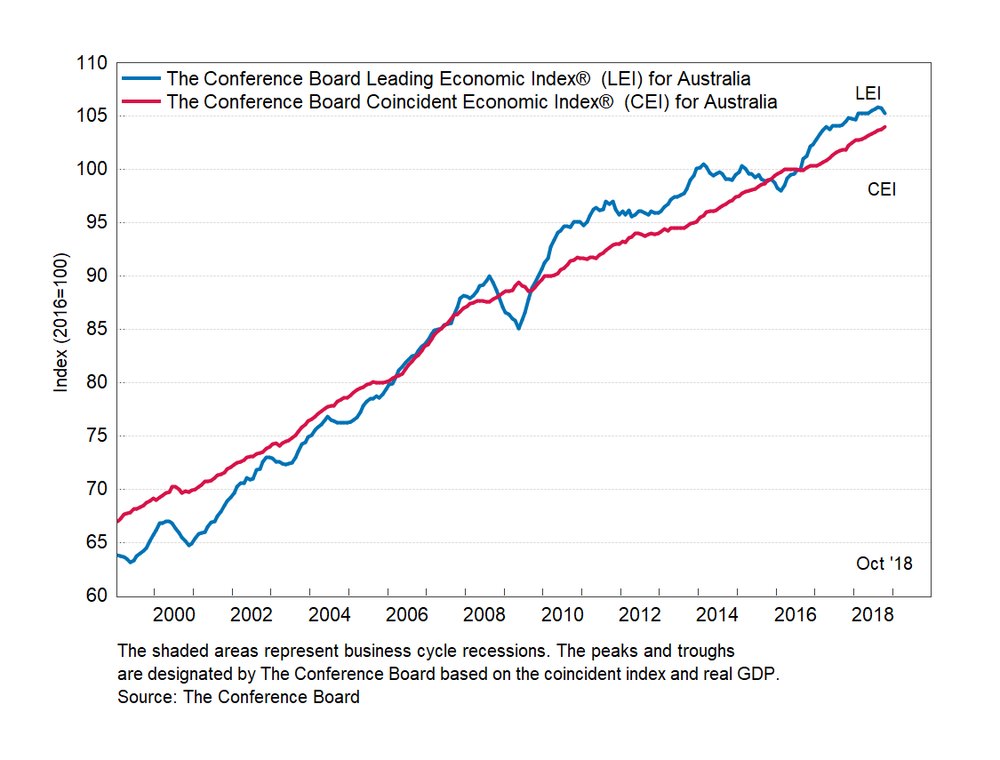 Результаты исследований, опубликованные Conference Board, показали: по итогам октября ведущий экономический индекс (LEI) для Австралии снизился на 0,5 процента, и составил 105,3 пункта (2016=100). Напомним, индекс зафиксировал падение на 0,1 процента в сентябре и увеличением на 0,2 процента в августе. В течение шести месяцев (с апреля 2018 года по октябрь 2018 года) показатель не изменился после повышения на 0,5 процента за предыдущий шестимесячный период (с марта 2018 года по сентябрь 2018 года).