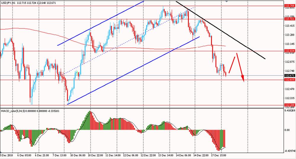Сегодня утром пара USD/JPY упала к Y112.65, продолжая вчерашнее снижение. В понедельник, оттолкнувшись от наклонной линии сопротивления, пара упала и закрыла день в красной зоне. Помимо этого, вчера USD/JPY пробила и закрепилась ниже линии поддержки восходящего канала от 10 декабря и линии скользящей средней MA 200 H1. Таким образом, на данный момент пара торгуется в рамках даунтренда и перешла под контроль медведей. Пока пара остается ниже мувинга и линии сопротивления последних 2-х торговых дней, есть смысл и далее искать точки входа на продажу при формирование коррекций.
