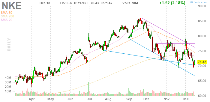 На текущий момент акции Nike Inc. (NKE) котируются по $71.42 (+2,18%)