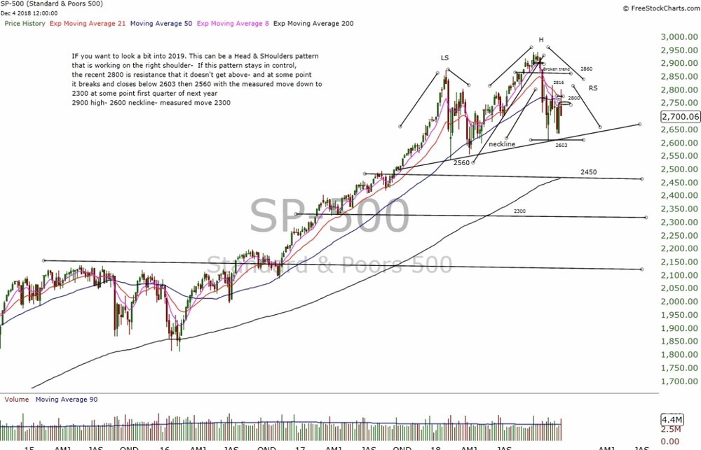 Чтобы этот рынок двигался вперед, он повторяет мнение некоторых других стратегов, которые говорят, что рынку необходимо избавиться от еще нескольких продавцов и найти прочное дно для восстановления. Он рассчитывает на то, что это дно для S&P будет около 2250 - 2300, основываясь на так называемой технической модели голова и плечи.