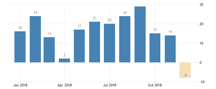 Композитный индекс снизился с 14 в ноябре до -8 в декабре, отягощенный падением суб-индексов новых заказов и поставок. Индекс поставок составил -25, что является самым низким значением с апреля 2009 года. Однако третья составляющая, суб-индекс занятости, вырос.