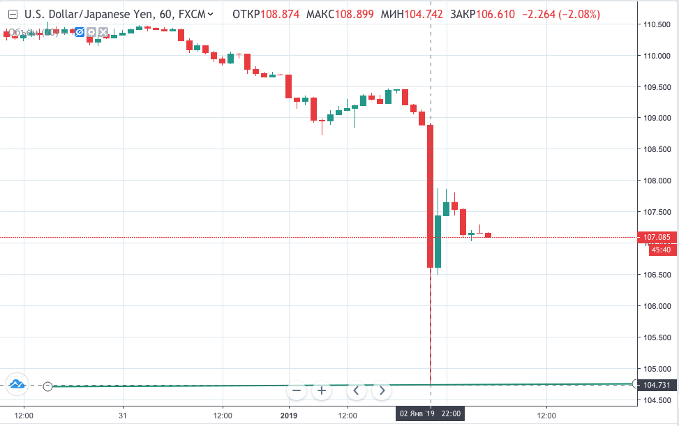 Вчера вечером валютная пара USD/JPY обрушилась к минимуму 2018 года. Котировки упали к уровню Y104.75. После того, как был зафиксирован данный минимум пара совершила большой отскок и на текущий момент торгуется около уровня Y107.00 (около 50% коррекции по сетке Фибоначчи). Стоит понимать, что после праздников объемы торгов на рынке остаются низкими. В связи с этим возможны такие резкие колебания. Многие экономисты связывают такой стремительный спрос на иену как на валюту убежище, после выхода негативных макроэкономических данных по Китаю и понижением прогнозов по продажам от Apple.