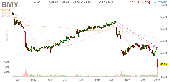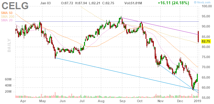 Акции Bristol-Myers упали на 15,2% в 2018 году, в то время как Celgene упал почти на 40% в прошлом году. В четверг акции Bristol упали еще почти на 12%, в то время как акции Celgene подскочили на 24%.