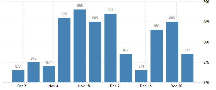 Отчет нефтесервисной компании Baker Hughes показал: с 29 декабря по 4 января количество активных буровых установок по добыче нефти в США снизилось на 8 штук, и составило 877 единиц. Напомним, годом ранее количество установок составляло 742 штук. Количество установок по добыче газа осталось на уровне 198 единиц. Общее число буровых установок (газовых, нефтяных и прочих) уменьшилось на 8 штук, и составило 1075 штуки.