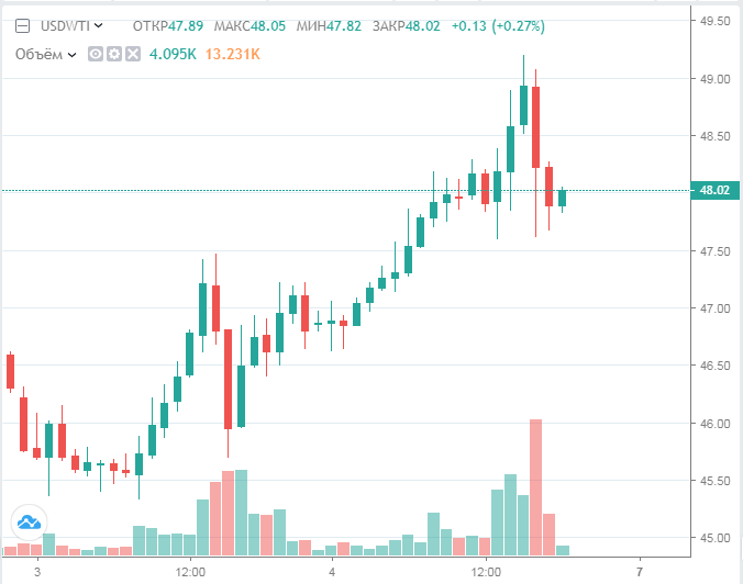 В настоящее время нефть марки West Texas Intermediate торгуется на уровне $48.02 (+2.61%) по сравнению с $47.89 до публикации данных.