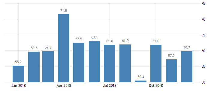 Согласно отчету, в декабре индекс деловой активности повысился до 59,7 пункта с 57,2 пункта в ноябре. Экономисты ожидали, что показатель вырастет до 58,1 пункта. Напомним, индикатор показывает уровень деловой активности промышленного сектора. Более чем 150 менеджерам из разных регионов и отраслей предлагается оценить уровень закупок по сравнению с предыдущим месяцем (выше, ниже или на том же уровне). Значение выше 50 означает увеличение закупок, а значение ниже 50 свидетельствует об уменьшении их объема.