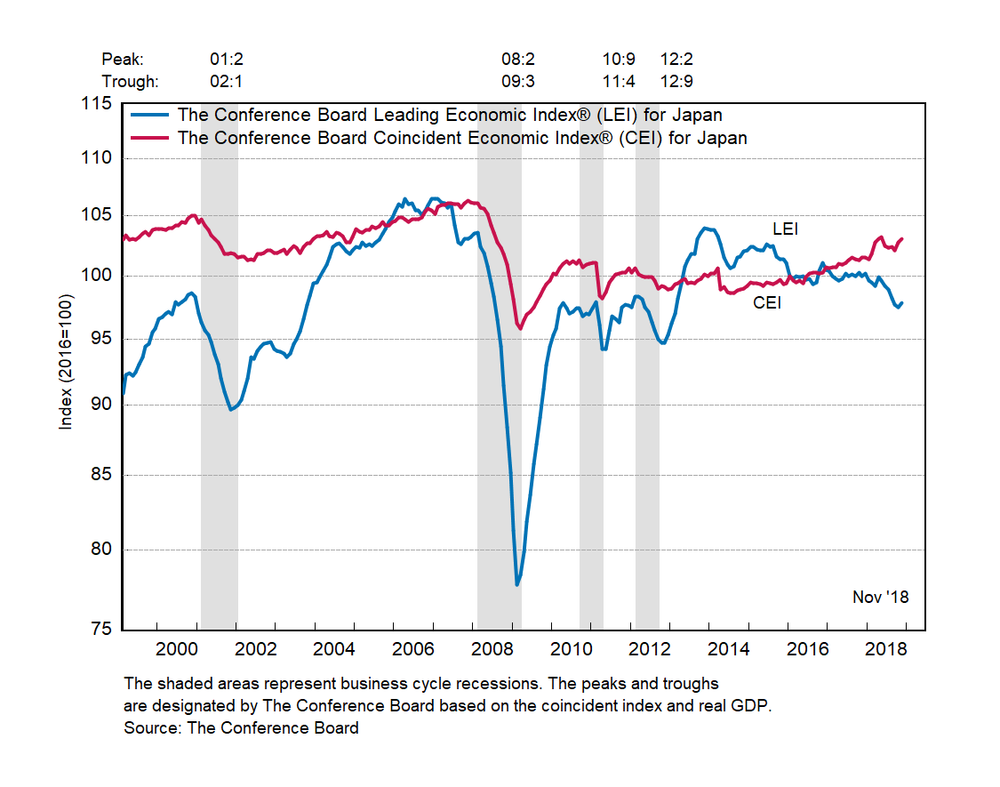 Результаты исследований, опубликованные Conference Board, показали: по итогам ноября ведущий экономический индекс (LEI) для Японии вырос на 0,3 процента, и составил 97,8 пункта (2016=100). Напомним, индекс зафиксировал снижение на 0,2 процента в октябре и падение на 0,5 процента в сентябре. В течение шести месяцев (с мая 2018 года по ноябрь 2018 года) показатель упал на 1,8 процента после снижения на 2,4 процента за предыдущий шестимесячный период (с апреля 2018 года по октябрь 2018 года).