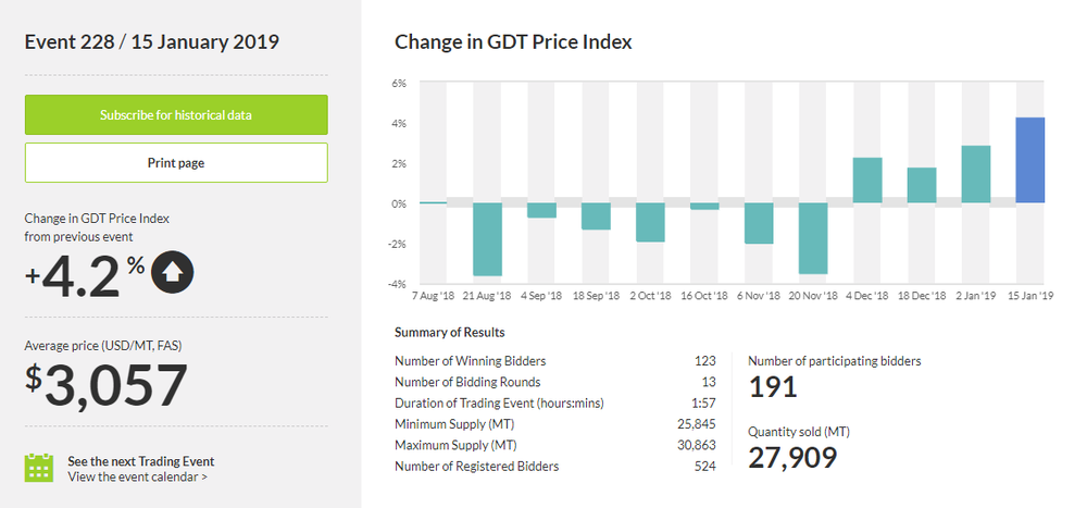 Как стало известно, стоимость молочной продукции выросла на 4,2%, до $3 057 за метрическую тонну после того, как увеличилась на 2,8% в ходе предыдущего аукциона. Результаты аукциона также показали, что стоимость цельного сухого молока подскочила на 3,0%, до $2 777 за метрическую тонну после повышения на 1,2% в ходе предыдущего аукциона. Тем временем, цена обезжиренного сухого молока взлетела на 10,3%, до $2 405 за метрическую тонну после того, как увеличилась на 7,9% в ходе предыдущего аукциона.