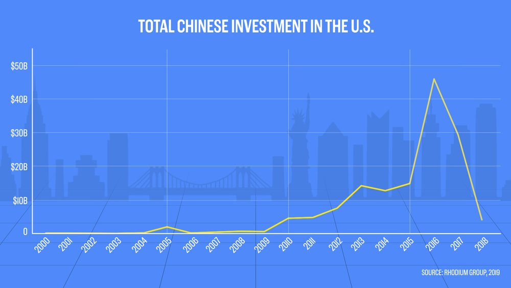 По данным независимого исследователя The Rhodium Group, в 2018 году китайские ПИИ в США упали до $4,8 млрд - масштабное снижение по сравнению с $29 млрд в 2017 году и $46 млрд в 2016 году.