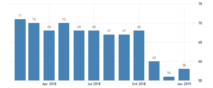 Индекс состояния рынка жилья от Национальной ассоциации строителей жилья (NAHB) вырос в январе на 2 пункта, до 58 пунктов. Это произошло после двух месяцев резкого падения настроений, до самого низкого уровня за последние два года. Напомним, в январе 2018 года индекс составлял 72 пункта. Значение показателя выше уровня 50 пунктов указывает на благоприятные перспективы.