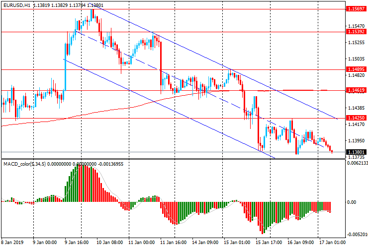 Пара EUR/USD продолжает снижение, начатое 10 января. Сегодня утром EUR/USD торгуется около вчерашнего минимума $1.1380. Единая валюта опустилась ниже линии скользящей средней MA 200 H1 и тестирует уровень МА (200) Н4 и находится в новом нисходящем тренде от 10 января. Пока EUR/USD будет находится в рамках данного тренда, есть смысл придерживаться южного направления в торговле и на окончание коррекции открывать новые продажи.