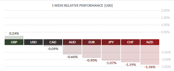 По итогам недели почти все основные валюты продемонстрировали снижение. Наибольшее падение по отношению к доллару США показал новозеландский доллар (-1,36%). Меньшее снижение зафиксировали швейцарский франк (-1,19%), японская иена (-1,07%), евро (-0,90%), австралийский доллар (-0,66%) и канадский доллар (-0,09%). Укрепился только британский фунт (+0,24%).