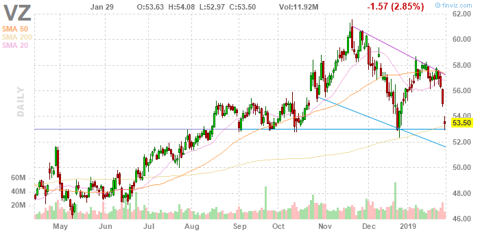 На текущий момент акции Verizon (VZ) котируются по $53.50 (-2,85%)