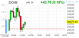 Большинство компонентов DOW в минусе (16 из 30). Лидер роста - 3M Company (MMM, +2.75%). Аутсайдер - Verizon Communications Inc. (VZ, -2.69%).