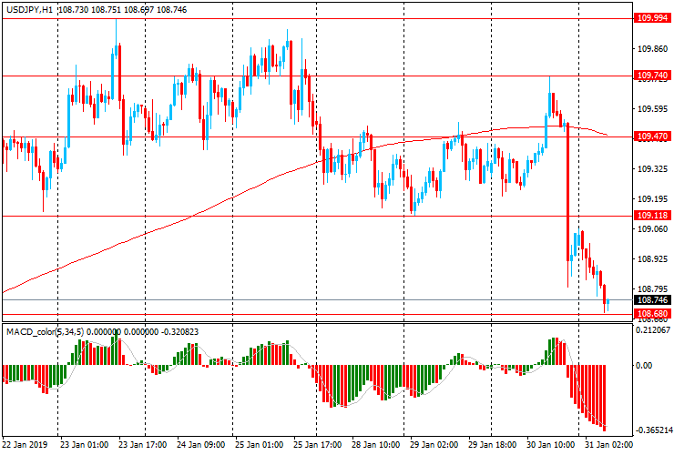Пара USD/JPY резко снизилась в конце вчерашних торгов после роста до Y109.75. Сегодня на ранних торгах пара продолжила снижаться и торгуется около 108.70. Пара опустилась ниже уровня скользящей средней МА (200) Н1 и четырехчасовом графике остается значительно ниже МА (200) Н4. Глобально USD/JPY по-прежнему находится в рамках даунтренда и остается под полным контролем медведей, а значит есть смысл и далее искать точки входа на продажу на образование коррекции.