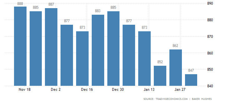 Отчет нефтесервисной компании Baker Hughes показал: с 26 января по 1 февраля количество активных буровых установок по добыче нефти в США упало на 15 штук, и составило 847 единиц. Напомним, годом ранее количество установок составляло 765 штук. Количество установок по добыче газа выросло на 1 штуку, до 198 единиц. Общее число буровых установок (газовых, нефтяных и прочих) снизилось на 14 штук, и составило 1045 штук.