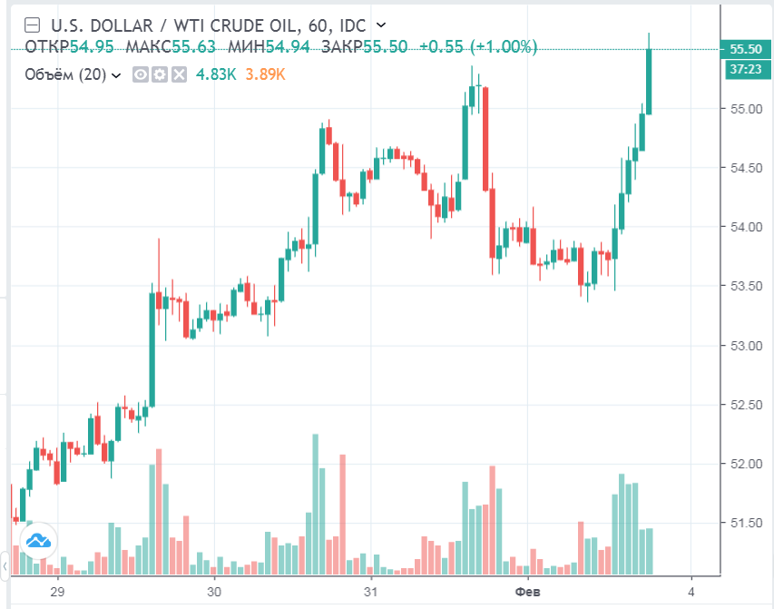 В настоящее время нефть марки West Texas Intermediate торгуется на уровне $55.50 (+2.82%) по сравнению с $54.95 до публикации данных.