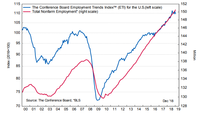 "Из-за прекращения работы правительства некоторые компоненты индекса тенденций занятости за этот месяц были недоступны или субъективными. Поэтому, мы призываем принять спад этого месяца с некоторой осторожностью. Тем не менее, мы все еще можем сделать вывод, что индекс несколько смягчился с лета, предполагая, что рост занятости замедлится в 2019 году. Общая экономическая активность быстро росла к концу 2018 года, предполагая, что рост занятости останется стабильным в начале 2019 года, но по мере замедления экономики, рост рабочих мест также замедлится позже в этом году. Замедление роста занятости не является неожиданным для экономики, которая так долго расширялась и достигла такого низкого уровня безработицы", - сказал Гад Леванон, главный экономист по Северной Америки в Conference Board.