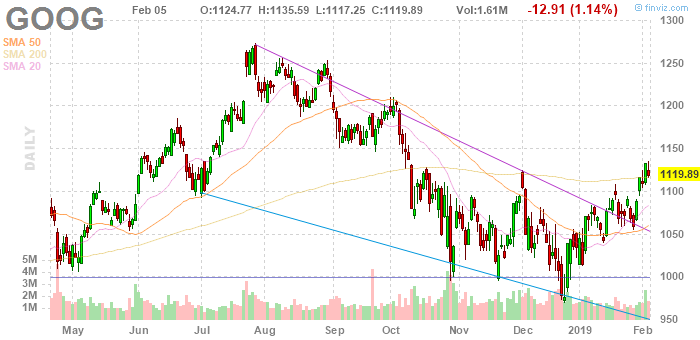 На текущий момент акции Alphabet (GOOG) котируются по $1,119.89 (-1,14%).