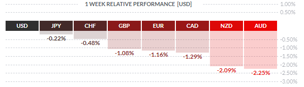 По итогам недели все основные валюты продемонстрировали снижение. Наибольшее падение по отношению к доллару США показали австралийский доллар (-2,25%) и новозеландский доллар (-2,09%). Меньшее снижение зафиксировали канадский доллар (-1,29%), евро (-1,16%), британский фунт (-1,08%), швейцарский франк (-0,48%) и японская иена (-0,22%).