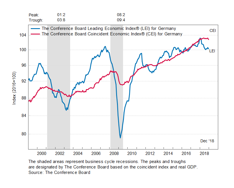 Результаты исследований, опубликованные Conference Board, показали: по итогам декабря ведущий экономический индекс (LEI) для Германии упал на 0,3 процента, и составил 100,3 пункта (2016=100). Напомним, индекс зафиксировал повышение на 0,3 процента в ноябре и нулевое изменение в октябре. В течение шести месяцев (с июня 2018 года по декабрь 2018 года) показатель упал на 0,5 процента после снижения на 0,8 процента за предыдущий шестимесячный период (с мая 2018 года по ноябрь 2018 года).