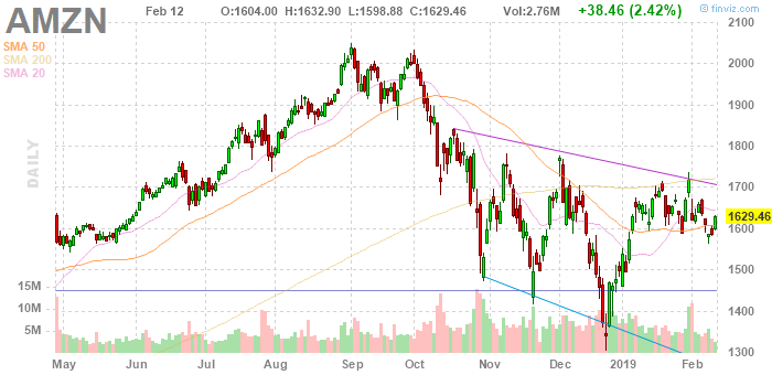 На текущий момент акции Amazon (AMZN) котируются по $1629.46 (+2.42%).