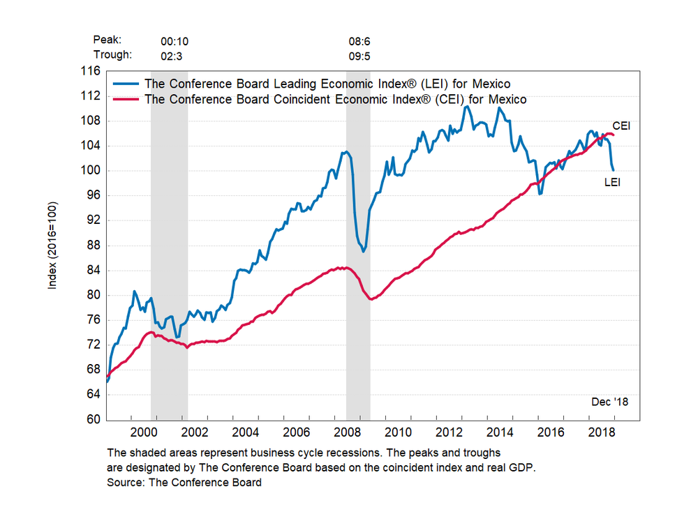 Результаты исследований, опубликованные Conference Board, показали: по итогам декабря ведущий экономический индекс (LEI) для Мексики упал на 1,0 процента, и составил 100,1 пункта (2016=100). Напомним, индекс зафиксировал снижение на 3,2 процента в ноябре и падение на 0,7 процента в октябре. В течение шести месяцев (с июня 2018 года по декабрь 2018 года) показатель упал на 3,8 процента после снижения на 3,1 процента за предыдущий шестимесячный период (с мая 2018 года по ноябрь 2018 года).