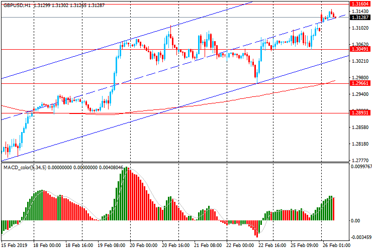Пара GBP/USD вчера торговалась в диапазоне $1.3050-1.3115. Сегодня на ранних торгах пара немного выросла, пробив линию сопротивления $1.3110, торгуясь около максимума февраля $1.3135. GBP/USD закрепилась выше уровня скользящей средней МА (200) Н1 и МА (200) Н4, что говорит начале формирования нового восходящего тренда. В этой ситуации лучше начать придерживаться северного направления в торговле и на образование коррекции искать точки входа на покупку.