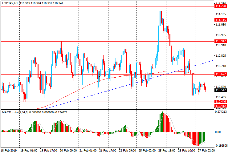 Пара USD/JPY резко снизилась вчера, достигнув минимума 19 февраля (Y110.40), после роста в понедельник до максимального значения с начала года Y111.20. Сегодня пара торгуется в узком диапазоне немного выше вчерашнего минимума. USD/JPY тестирует уровень скользящей средней МА (200) Н1 и не смотря на вчерашнее падение, пара по прежнему остается выше МА (200) Н4. USD/JPY также продолжает оставаться в рамках восходящего канала от 3 января. В этой ситуации лучше и далее придерживаться северного направления в торговле и на образование коррекции искать точки входа на покупку.