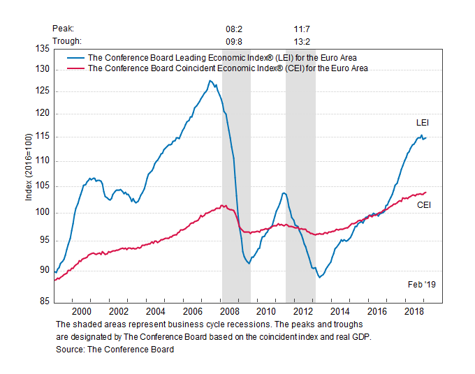 Результаты исследований, опубликованные Conference Board, показали: по итогам февраля ведущий экономический индекс (LEI) для еврозоны вырос на 0,1 процента, и составил 114,8 пункта (2016=100). Напомним, индекс зафиксировал повышение на 0,1 процента в январе и падение на 0,7 процента в декабре. В течение шести месяцев (с августа 2018 года по февраль 2019 года) показатель вырос на 0,2 процента после увеличения на 0,7 процента за предыдущий шестимесячный период (с июля 2018 года по январь 2019 года).