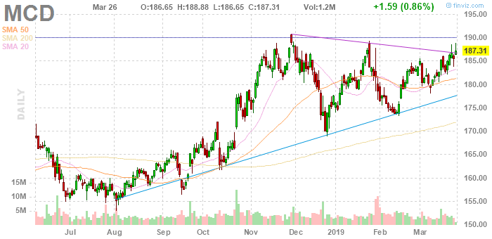 На текущий момент акции McDonald’s (MCD) котируются по $187.31 (+0.86%).