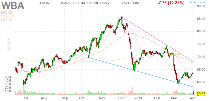 На текущий момент акции Walgreens Boots Alliance (WBA) котируются по $55.73 (-12.22%).