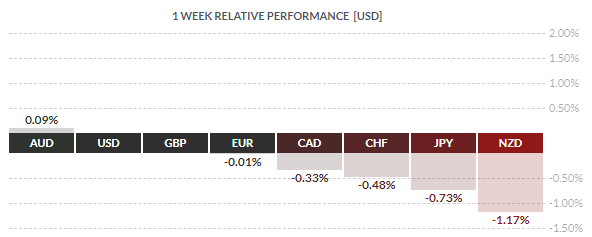 По итогам недели почти все основные валюты продемонстрировали снижение. Наибольший спад по отношению к доллару США показал новозеландский доллар (-1,17%). Меньшее падение зафиксировали японская иена (-0,73%), швейцарский франк (-0,48%) и канадский доллар (-0,33%). Почти без изменений завершили неделю евро (-0,01%) и фунт (0,0). Вырос только австралийский доллар (+0,09%).