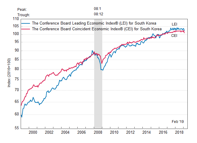 Результаты исследований, опубликованные Conference Board, показали: по итогам февраля ведущий экономический индекс (LEI) для Южной Кореи упал на 1,2 процента, и составил 102,4 пункта (2016=100). Напомним, индекс зафиксировал повышение на 0,1 процента в январе и увеличение на 0,6 процента в декабре. В течение шести месяцев (с августа 2018 года по февраль 2019 года) показатель упал на 0,8 процента после увеличения на 0,2 процента за предыдущий шестимесячный период (с июля 2018 года по январь 2019 года).
