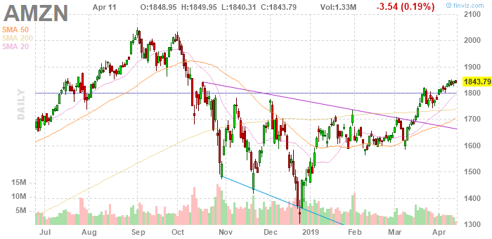 На текущий момент акции Amazon (AMZN) котируются по $1,843.79 (-0.19%).