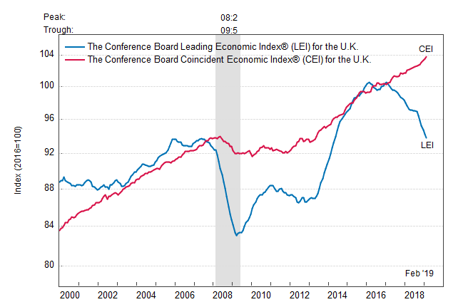 Результаты исследований, опубликованные Conference Board, показали: по итогам февраля ведущий экономический индекс (LEI) для Британии упал на 0,4 процента, и составил 93,8 пункта (2016=100). Напомним, индекс зафиксировал снижение по 0,5 процента в январе и декабре. В течение шести месяцев (с августа 2018 года по февраль 2019 года) показатель упал на 3,2 процента после снижения на 2,9 процента за предыдущий шестимесячный период (с июля 2018 года по январь 2019 года).