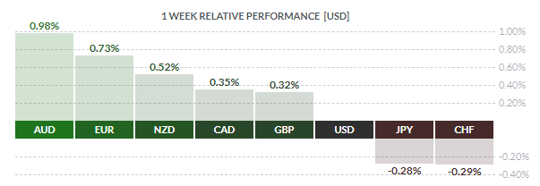 По итогам недели почти все основные валюты продемонстрировали повышение. Больше остальных вырос австралийский доллар (+0,98%). Меньшее повышение зафиксировали евро (+0,73%), новозеландский доллар (+0,52%), канадский доллар (+0,35%) и британский фунт (+0,32%). Падение записали японская иена (-0,28%) и швейцарский франк (-0,29%).