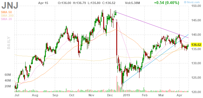 Согласно обнародованному отчету, прибыль компании Johnson & Johnson (JNJ) по итогам первого квартала 2019 финансового года достигла $2.10 в расчете на одну акцию (против $2.06 в первом квартале 2018 года), что оказалось выше среднего прогноза аналитиков на уровне $2.04.