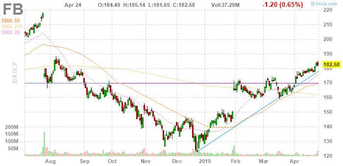 Согласно обнародованному отчету, прибыль компании Facebook (FB) по итогам первого квартала 2019 финансового года достигла $1.89 в расчете на одну акцию (против $1.69 в первом квартале 2018 года), что оказалось выше среднего прогноза аналитиков на уровне $1.61.