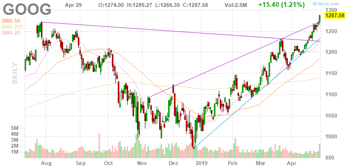 Согласно обнародованному отчету, прибыль компании Alphabet (GOOG) по итогам первого квартала 2019 финансового года достигла $9.50 в расчете на одну акцию, с учетом штрафа в $1.7 млрд. от ЕС ($11.90 без учета штрафа), что что может быть несопоставимо со средним прогнозом аналитиков на уровне $10.44.