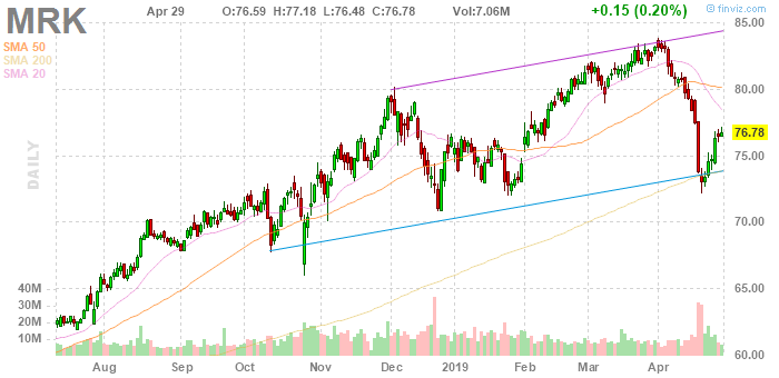 Согласно обнародованному отчету, прибыль компании Merck (MRK) по итогам первого квартала 2019 финансового года достигла $1.22 в расчете на одну акцию (против $1.05 в первом квартале 2018 года), что оказалось выше среднего прогноза аналитиков на уровне $1.05.