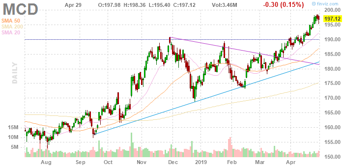 Согласно обнародованному отчету, прибыль компании McDonald's (MCD) по итогам первого квартала 2019 финансового года достигла $1.78 в расчете на одну акцию (против $1.79 в первом квартале 2018 года), что оказалось выше среднего прогноза аналитиков на уровне $1.76.