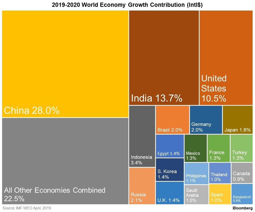 Даже несмотря на то, что темпы роста Китая замедлились, размер его экономики и темпы его роста означают, что в ближайшем будущем он будет оставаться основным источником глобального роста ВВП с большим отрывом. США - которые, как ожидается, по-прежнему будут вносить значительный вклад в глобальный рост - по прогнозам, уменьшат свою долю до 10,5 процента с 12,3 процента в октябре прошлого года по мере распространения демократизации роста ВВП.