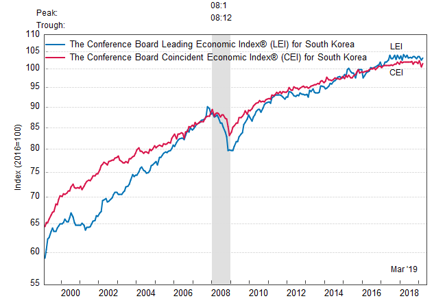 Результаты исследований, опубликованные Conference Board, показали: по итогам марта ведущий экономический индекс (LEI) для Южной Кореи вырос на 0,7 процента, и составил 103,2 пункта (2016=100). Напомним, индекс зафиксировал падение на 1,1 процента в феврале и увеличение на 0,1 процента в январе. В течение шести месяцев (с сентября 2018 года по март 2019 года) показатель упал на 0,3 процента после снижения на 0,7 процента за предыдущий шестимесячный период (с августа 2018 года по февраль 2019 года).