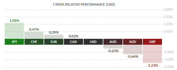 По итогам недели большинство основных валют продемонстрировали повышение. Наибольший прирост по отношению к доллару США показала японская иена (+1,08%). Меньшее повышение зафиксировали швейцарский франк (+0,47%), евро (+0,29%) и канадский доллар (+0,02%). Падение зафиксировали британский фунт (-1,23%), новозеландский доллар (-0,64%) и австралийский доллар (-0,25%).