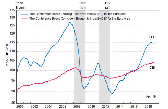 Результаты исследований, опубликованные Conference Board, показали: по итогам апреля ведущий экономический индекс (LEI) для еврозоны не изменился, и составил 114,7 пункта (2016=100). Напомним, индекс зафиксировал нулевое изменение в марте и снижение на 0,1 процента в феврале. В течение шести месяцев (с октября 2018 года по апрель 2019 года) показатель упал на 0,2 процента после снижения на 0,1 процента за предыдущий шестимесячный период (с сентября 2018 года по март 2019 года).