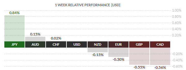 По итогам недели большинство основных валют продемонстрировали снижение. Наибольшее падение по отношению к доллару США показали канадский доллар (-0,56%) и британский фунт (-0,55%). Меньшее снижение зафиксировали евро (-0,30%) и новозеландский доллар (-0,15%). Подорожали только японская иена (+0,84%), австралийский доллар (+0,15%) м швейцарский франк (+0,02%).