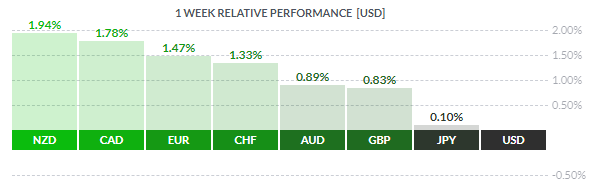 По итогам недели все основные валюты продемонстрировали повышение. Наибольший прирост по отношению к доллару США показал новозеландский доллар (+1,94%). Меньшее повышение зафиксировали канадский доллар (+1,78%), евро (+1,47%), швейцарский франк (+1,33%), австралийский доллар (+0,89%), британский фунт (+0,83%) и японская иена (+0,10%),